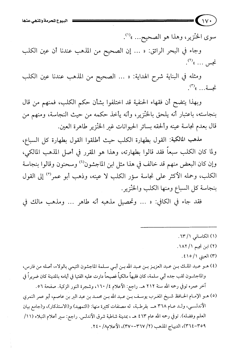 وبهذا يتضح أن فقهاء الحنفية قد اختلفوا بشأن حكم الكلب، فمنهم من قال بنجاسته، باعتبار أنه يلحق بالخنْزير، وأنه يأخذ حكمه من حيث النجاسة، ومنهم من قال بعدم نجاسة عينه وألحقه بسائر الحيوانات غير الخنْزير طاهرة العين.