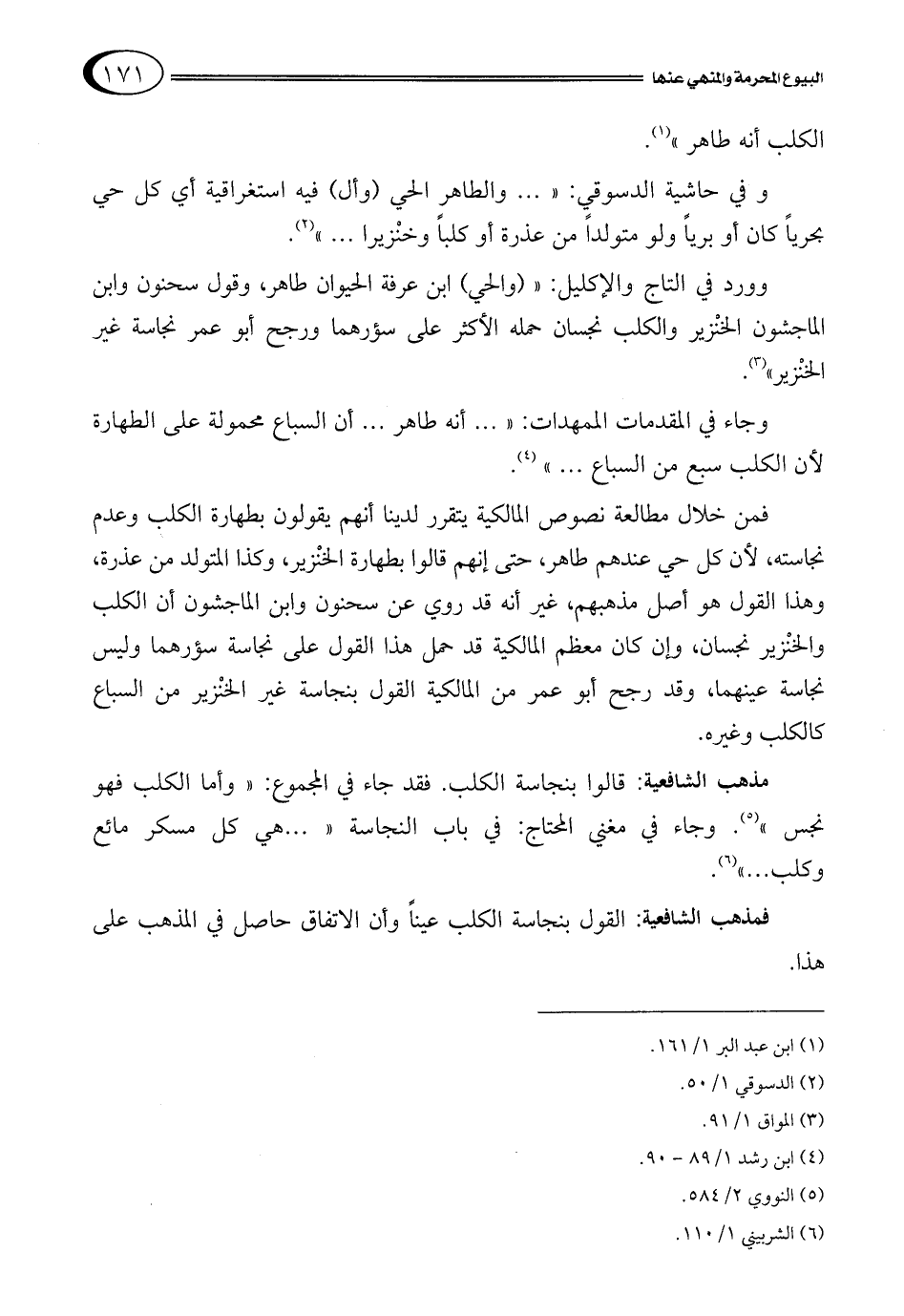 وورد في التاج والإكليل: "والحي ابن عرفة الحيوان طاهر، وقول سحنون وابن الماجشون الخنْزير والكلب نجسان حمله الأكثر على سؤرهما ورجح أبو عمر نجاسة غير الخنْزير"3.