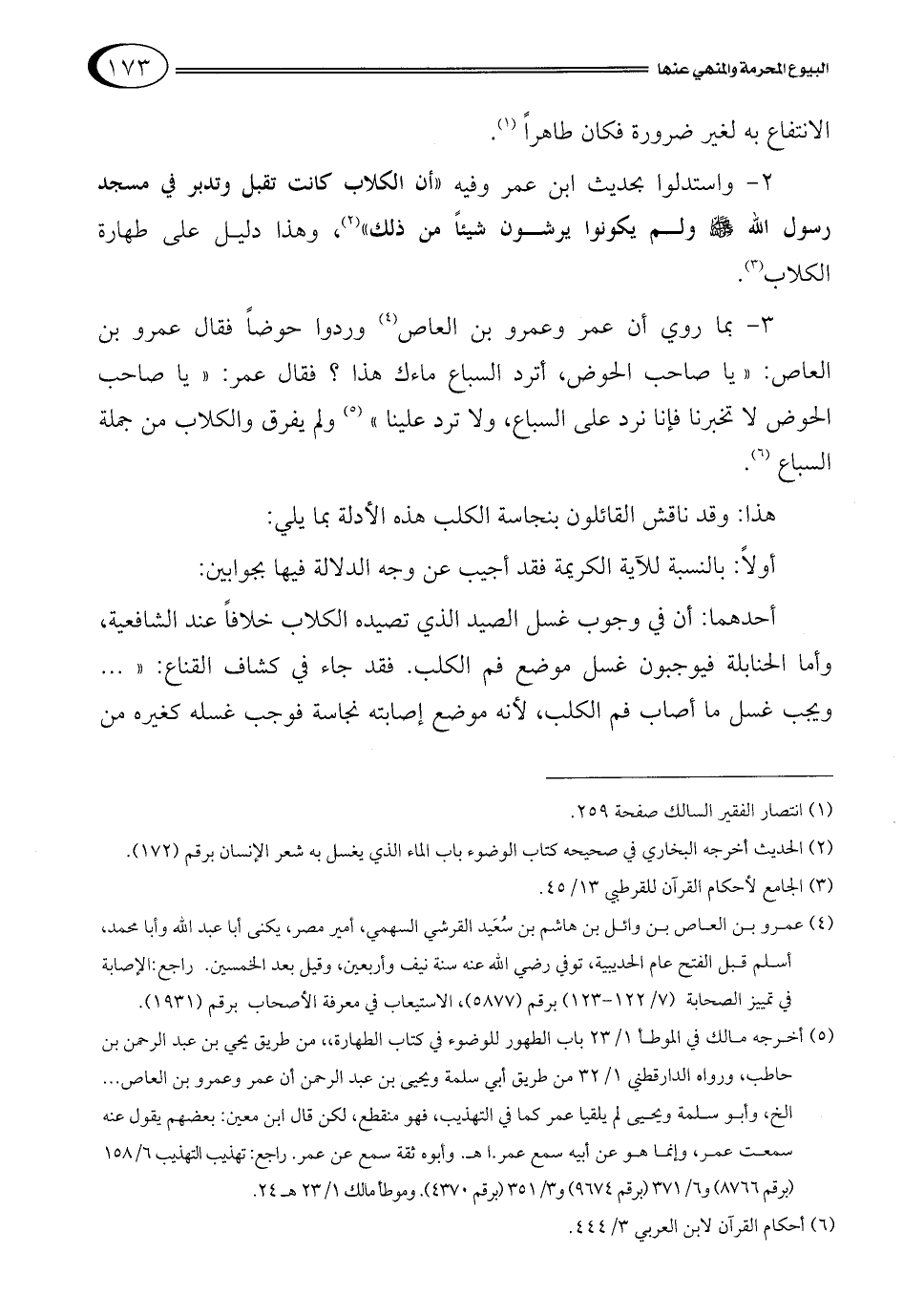 3- بما روي أن عمر وعمرو بن العاص4 وردوا حوضاً فقال عمرو بن العاص: "يا صاحب الحوض، أترد السباع ماءك هذا؟ فقال عمر: "يا صاحب الحوض لا تخبرنا فإنا نرد على السباع، ولا ترد علينا" 5 ولم يفرق والكلاب من جملة السباع6.