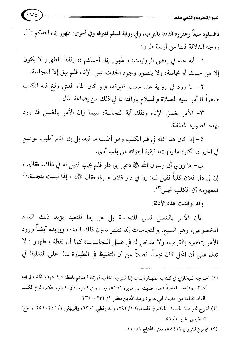 2- ما ورد في رواية عند مسلم فليرقه، ولو كان الماء الذي ولغ فيه الكلب طاهراً لما أمر عليه الصلاة والسلام بإراقته لما في ذلك من إضاعة المال.