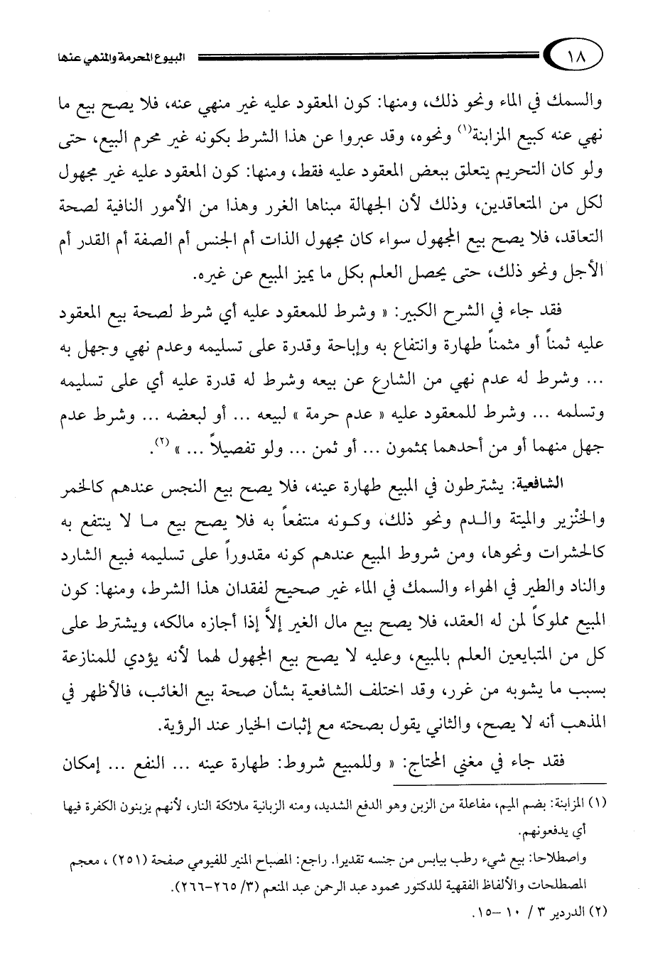فقد جاء في الشرح الكبير: "وشرط للمعقود عليه أي شرط لصحة بيع المعقود عليه ثمناً أو مثمناً طهارة وانتفاع به وإباحة وقدرة على تسليمه وعدم نهي وجهل به ... وشرط له عدم نهي من الشارع عن بيعه وشرط له قدرة عليه أي على تسليمه وتسلمه ... وشرط للمعقود عليه "عدم حرمة" لبيعه ... أو لبعضه ... وشرط عدم جهل منهما أو من أحدهما بمثمون ... أو ثمن ... ولو تفصيلاً ... "2.