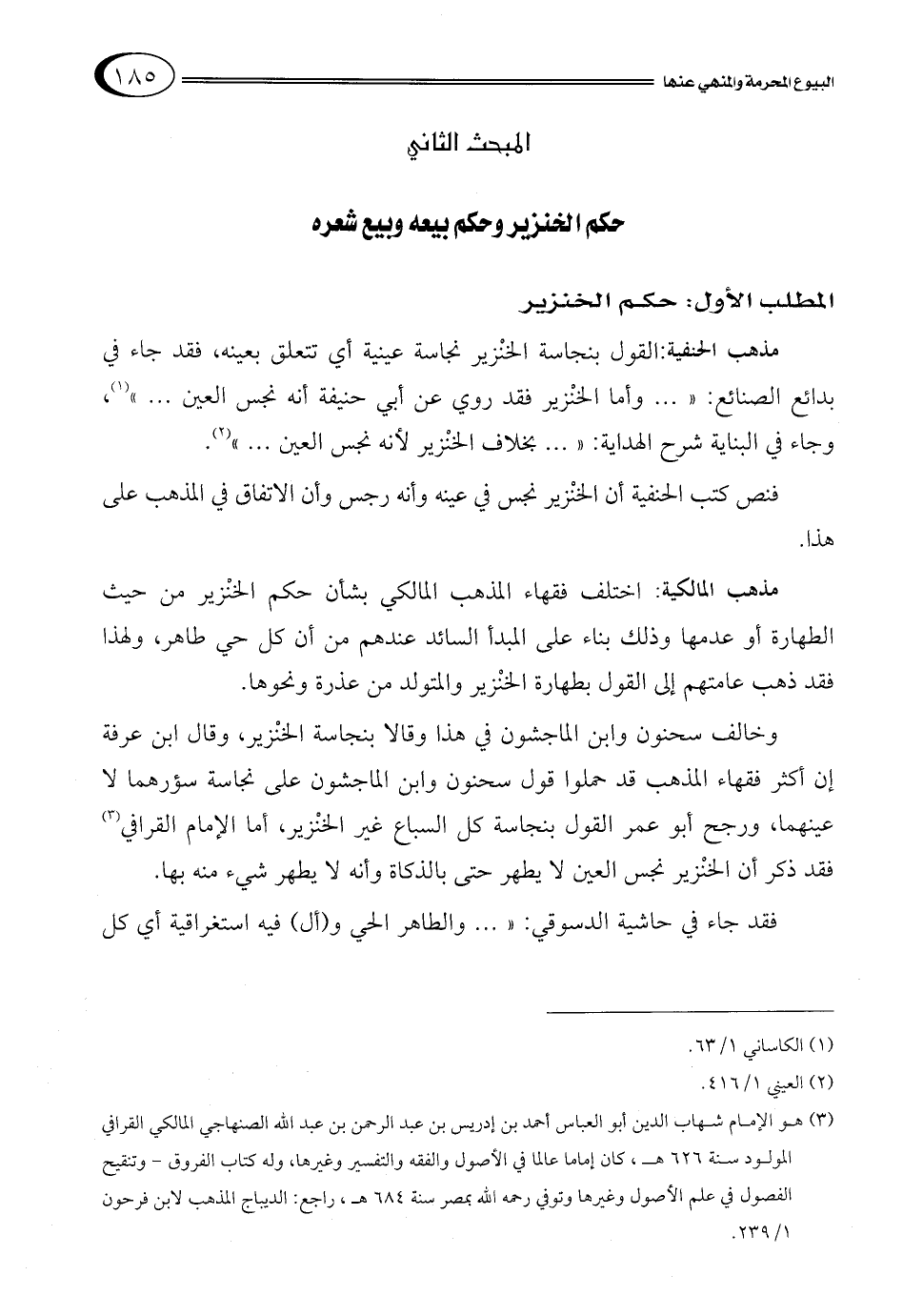 وخالف سحنون وابن الماجشون في هذا وقالا بنجاسة الخنْزير، وقال ابن عرفة إن أكثر فقهاء المذهب قد حملوا قول سحنون وابن الماجشون على نجاسة سؤرهما لا عينهما، ورجح أبو عمر القول بنجاسة كل السباع غير الخنْزير، أما الإمام القرافي3 فقد ذكر أن الخنْزير نجس العين لا يطهر حتى بالذكاة وأنه لا يطهر شيء منه بها.