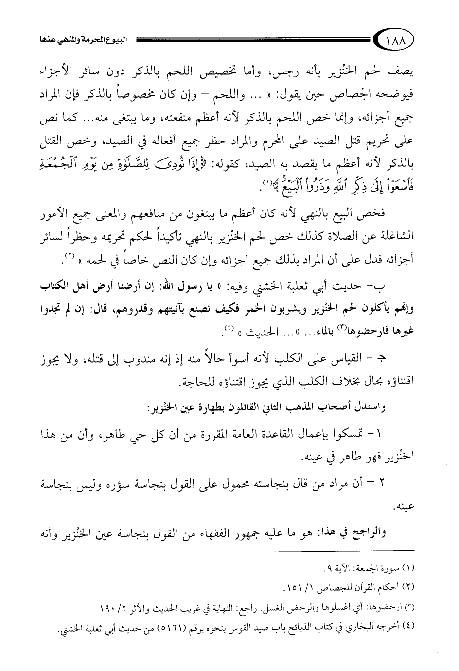 يصف لحم الخنْزير بأنه رجس، وأما تخصيص اللحم بالذكر دون سائر الأجزاء فيوضحه الجصاص حين يقول: " ... واللحم – وإن كان مخصوصاً بالذكر فإن المراد جميع أجزائه، وإنما خص اللحم بالذكر لأنه أعظم منفعته، وما يبتغى منه ... كما نص على تحريم قتل الصيد على المحرم والمراد حظر جميع أفعاله في الصيد، وخص القتل بالذكر لأنه أعظم ما يقصد به الصيد، كقوله: {إِذَا نُودِيَ لِلصَّلاةِ مِنْ يَوْمِ الْجُمُعَةِ فَاسَعَوْا إِلَى ذِكْرِ اللَّهِ وَذَرُوا الْبَيْعَ} 1.