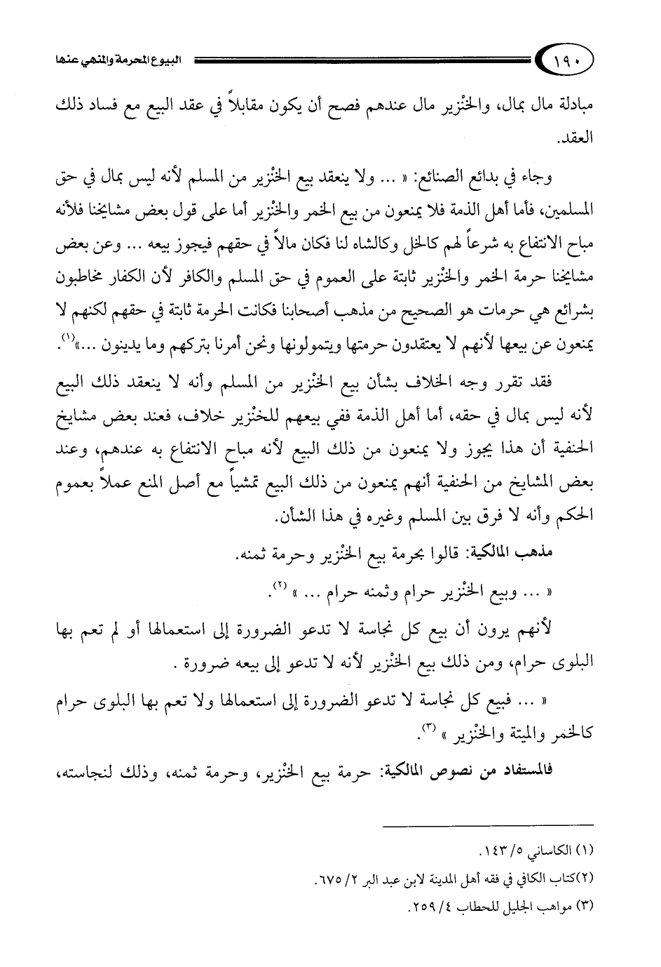 وجاء في بدائع الصنائع: " ... ولا ينعقد بيع الخنْزير من المسلم لأنه ليس بمال في حق المسلمين، فأما أهل الذمة فلا يمنعون من بيع الخمر والخنْزير أما على قول بعض مشايخنا فلأنه مباح الانتفاع به شرعاً لهم كالخل وكالشاه لنا فكان مالاً في حقهم فيجوز بيعه ... وعن بعض مشايخنا حرمة الخمر والخنْزير ثابتة على العموم في حق المسلم والكافر لأن الكفار مخاطبون بشرائع هي حرمات هو الصحيح من مذهب أصحابنا فكانت الحرمة ثابتة في حقهم لكنهم لا يمنعون عن بيعها لأنهم لا يعتقدون حرمتها ويتمولونها ونحن أمرنا بتركهم وما يدينون ... "1.