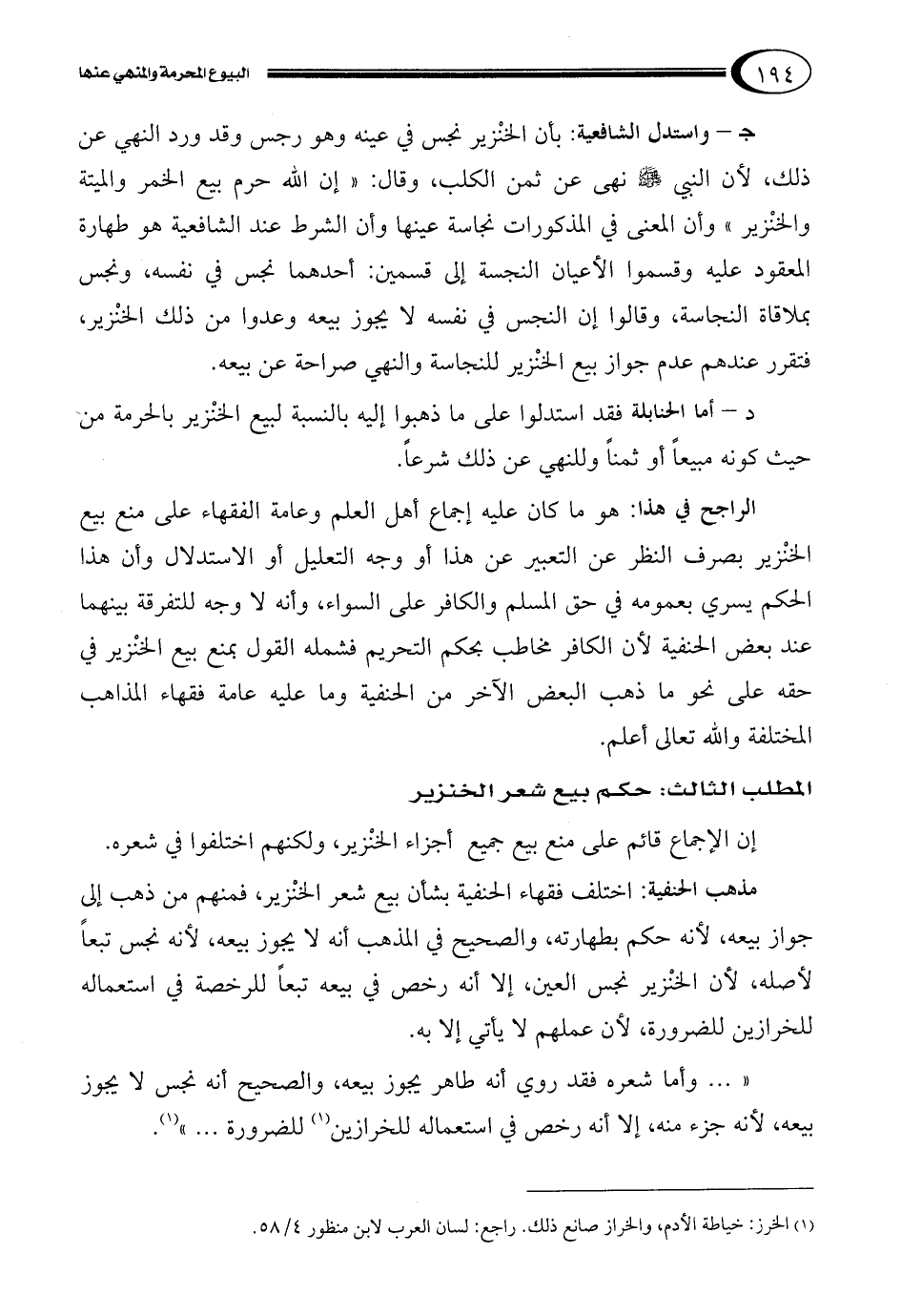 د – أما الحنابلة فقد استدلوا على ما ذهبوا إليه بالنسبة لبيع الخنْزير بالحرمة من حيث كونه مبيعاً أو ثمناً وللنهي عن ذلك شرعاً.