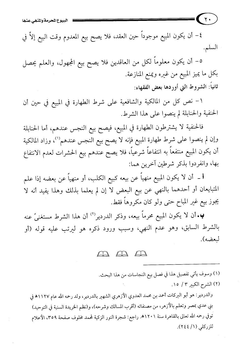 ب ـ أن لا يكون المبيع محرماً بيعه، وذكر الدردير2 أن هذا الشرط مستغنىً عنه بالشرط السابق، وهو عدم النهي، وسبب ورود ذكره هو ليرتب عليه قوله أو لبعضه.