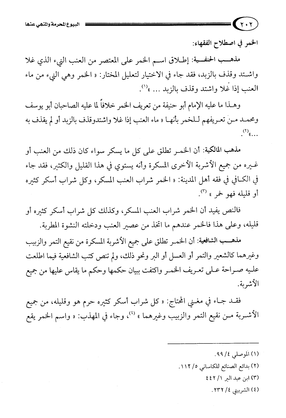 وهذا ما عليه الإمام أبو حنيفة من تعريف الخمر خلافاً لما عليه الصاحبان أبو يوسف ومحمد من تعريفهم للخمر بأنها "ماء العنب إذا غلا واشتدوقذف بالزبد أو لم يقذف به ... "2.