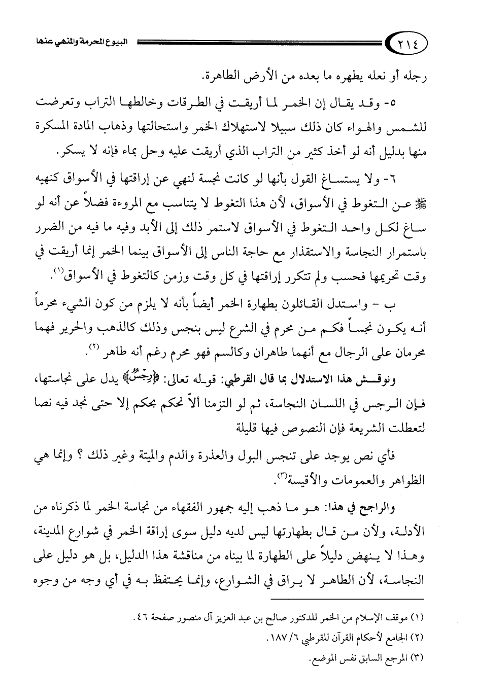 6- ولا يستساغ القول بأنها لو كانت نجسة لنهي عن إراقتها في الأسواق كنهيه صلى الله عليه وسلم عن التغوط في الأسواق، لأن هذا التغوط لا يتناسب مع المروءة فضلاً عن أنه لو ساغ لكل واحد التغوط في الأسواق لاستمر ذلك إلى الأبد وفيه ما فيه من الضرر باستمرار النجاسة والاستقذار مع حاجة الناس إلى الأسواق بينما الخمر إنما أريقت في وقت تحريمها فحسب ولم تتكرر إراقتها في كل وقت وزمن كالتغوط في الأسواق1.