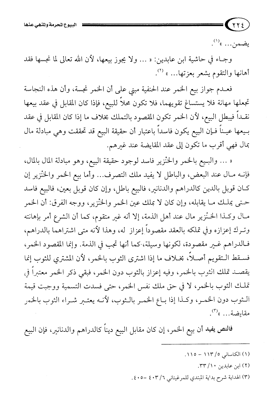 " ... والبيع بالخمر والخنْزير فاسد لوجود حقيقة البيع، وهو مبادلة المال بالمال، فإنه مال عند البعض، والباطل لا يفيد ملك التصرف ... وأما بيع الخمر والخنْزير إن كان قوبل بالدين كالدراهم والدنانير، فالبيع باطل، وإن كان قوبل بعين، فالبيع فاسد حتى يملك ما يقابله، وإن كان لا يملك عين الخمر والخنْزير، ووجه الفرق: أن الخمر مال وكذا الخنْزير مال عند أهل الذمة، إلا أنه غير متقوم، كما أن الشرع أمر بإهانته وترك إعزازه وفي تملكه بالعقد مقصوداً إعزاز له، وهذا لأنه متى اشتراهما بالدراهم، فالدراهم غير مقصودة، لكونها وسيلة، كما أنها تجب في الذمة. وإنما المقصود الخمر، فسقط التقويم أصلاً، بخلاف ما إذا اشترى الثوب بالخمر، لأن المشتري للثوب إنما يقصد تملك الثوب بالخمر، وفيه إعزاز بالثوب دون الخمر، فبقي ذكر الخمر معتبراً في تملك الثوب بالخمر، لا في حق ملك نفس الخمر، حتى فسدت التسمية ووجبت قيمة الثوب دون الخمر، وكذا إذا باع الخمر بالثوب، لأنه يعتبر شراء الثوب بالخمر مقايضة ... "3.