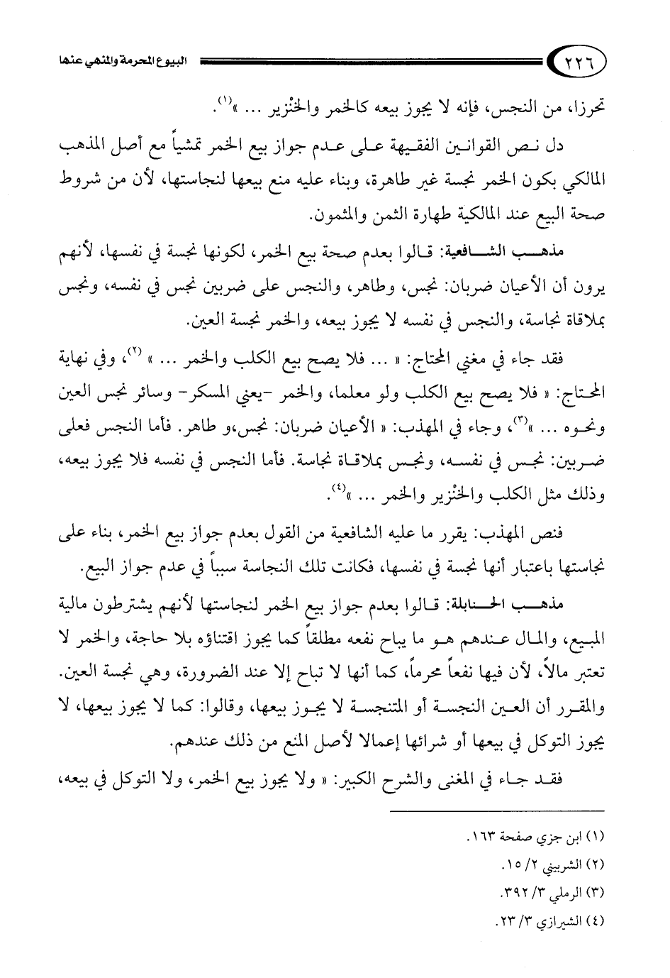 فنص المهذب: يقرر ما عليه الشافعية من القول بعدم جواز بيع الخمر، بناء على نجاستها باعتبار أنها نجسة في نفسها، فكانت تلك النجاسة سبباً في عدم جواز البيع.