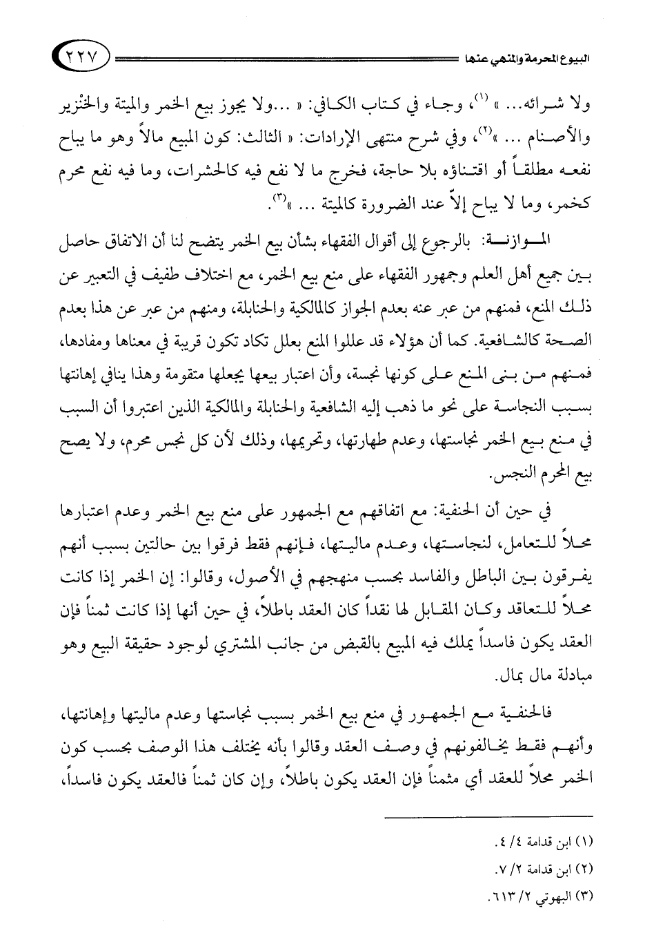 ولا شرائه ... "1. وجاء في كتاب الكافي: " ... ولا يجوز بيع الخمر والميتة والخنْزير والأصنام ... "2. وفي شرح منتهى الإرادات: "الثالث: كون المبيع مالاً وهو ما يباح نفعه مطلقاً أو اقتناؤه بلا حاجة، فخرج ما لا نفع فيه كالحشرات، وما فيه نفع محرم كخمر، وما لا يباح إلاّ عند الضرورة كالميتة ... "3.