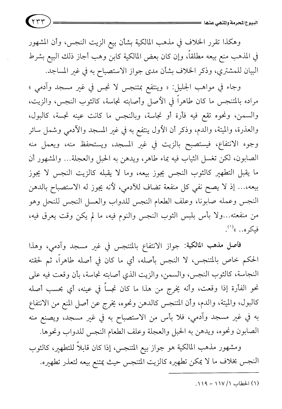 وهكذا تقرر الخلاف في مذهب المالكية بشأن بيع الزيت النجس، وأن المشهور في المذهب منع بيعه مطلقاً، وإن كان بعض المالكية كابن وهب أجاز ذلك البيع بشرط البيان للمشتري، وذكر الخلاف بشأن مدى جواز الاستصباح به في غير المساجد.