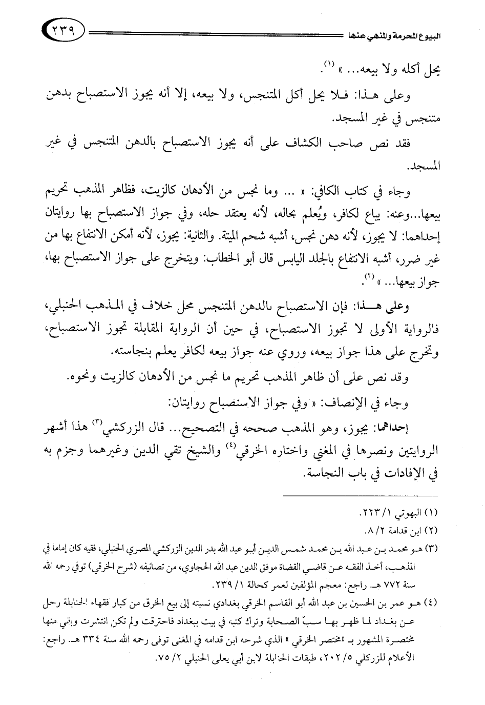 وجاء في كتاب الكافي: " ... وما نجس من الأدهان كالزيت، فظاهر المذهب تحريم بيعها ... وعنه: يباع لكافر، ويُعلم بحاله، لأنه يعتقد حله، وفي جواز الاستصباح بها روايتان إحداهما: لا يجوز، لأنه دهن نجس، أشبه شحم الميتة. والثانية: يجوز، لأنه أمكن الانتفاع بها من غير ضرر، أشبه الانتفاع بالجلد اليابس قال أبو الخطاب: ويتخرج على جواز الاستصباح بها، جواز بيعها ... "2.