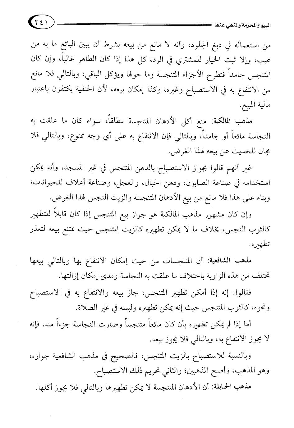 من استعماله في دبغ الجلود، وأنه لا مانع من بيعه بشرط أن يبين البائع ما به من عيب، وإلا ثبت الخيار للمشتري في الرد، كل هذا إذا كان الطاهر غالباً، وإن كان المتنجس جامداً فتطرح الأجزاء المتنجسة وما حولها ويؤكل الباقي، وبالتالي فلا مانع من الانتفاع به في الاستصباح وغيره، وكذا إمكان بيعه، لأن الحنفية يكتفون باعتبار مالية المبيع.
