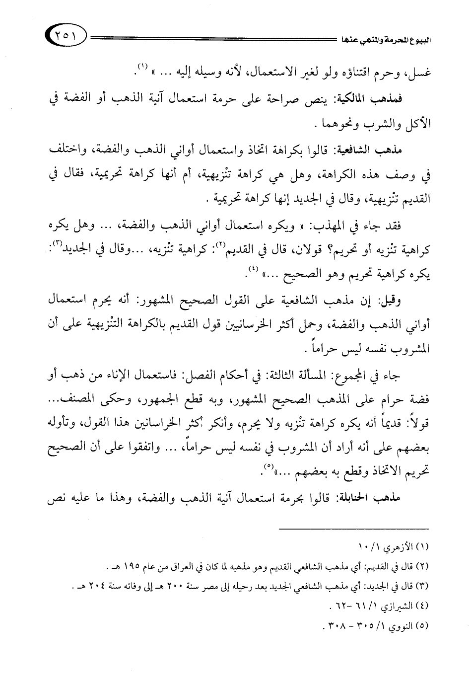 فقد جاء في المهذب: "ويكره استعمال أواني الذهب والفضة، ... وهل يكره كراهية تنْزيه أو تحريم؟ قولان، قال في القديم2: كراهية تنْزيه، ... وقال في الجديد3: يكره كراهية تحريم وهو الصحيح ... "4.