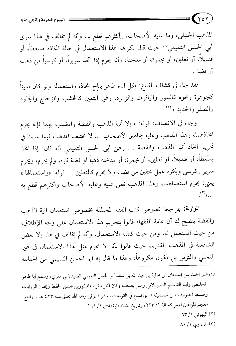 المذهب الحنبلي، وما عليه الأصحاب، وأكثرهم قطع به، وأنه لم يخالف في هذا سوى أبي الحسن التميمي1 حيث قال بكراهة هذا الاستعمال في حالة اتخاذه مسعطاً، أو قنديلاً، أو نعلين، أو مجمرة، أو مدخنة، وأنه يحرم إذا اتخذ سريراً، أو كرسياً من ذهب أو فضة.