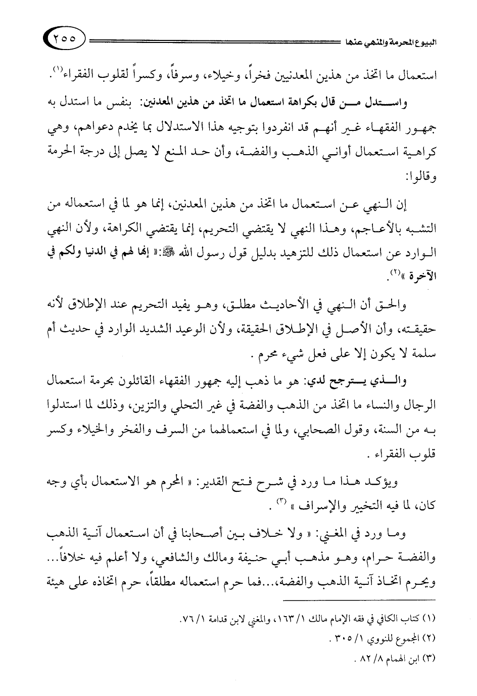 وما ورد في المغني: "ولا خلاف بين أصحابنا في أن استعمال آنية الذهب والفضة حرام، وهو مذهب أبي حنيفة ومالك والشافعي، ولا أعلم فيه خلافاً ... ويحرم اتخاذ آنية الذهب والفضة، ... فما حرم استعماله مطلقاً، حرم اتخاذه على هيئة
