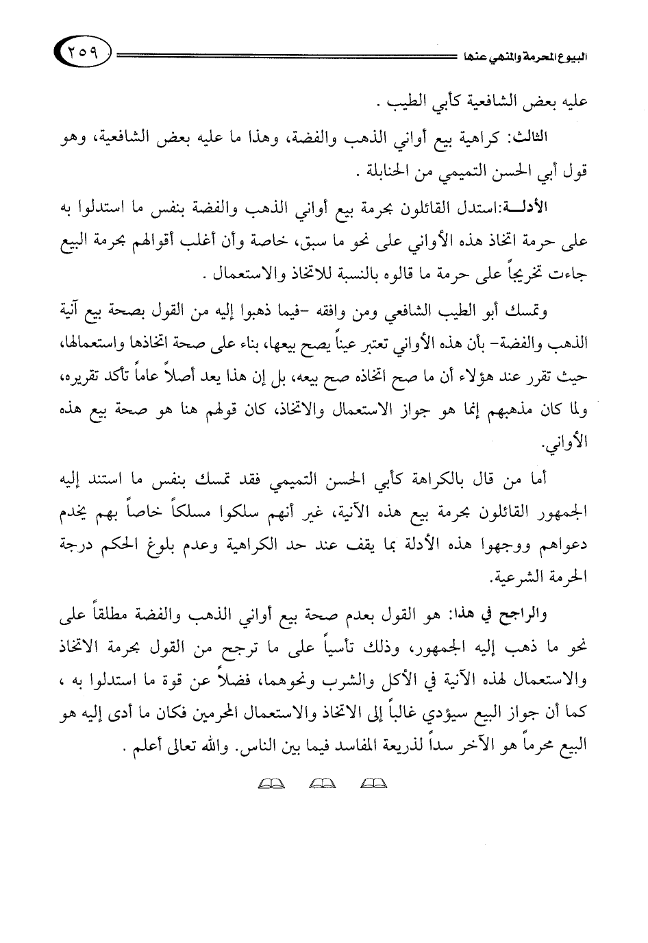 والراجح في هذا: هو القول بعدم صحة بيع أواني الذهب والفضة مطلقاً على نحو ما ذهب إليه الجمهور، وذلك تأسياً على ما ترجح من القول بحرمة الاتخاذ والاستعمال لهذه الآنية في الأكل والشرب ونحوهما، فضلاً عن قوة ما استدلوا به، كما أن جواز البيع سيؤدي غالباً إلى الاتخاذ والاستعمال المحرمين فكان ما أدى إليه هو البيع محرماً هو الآخر سداً لذريعة المفاسد فيما بين الناس. والله تعالى أعلم.