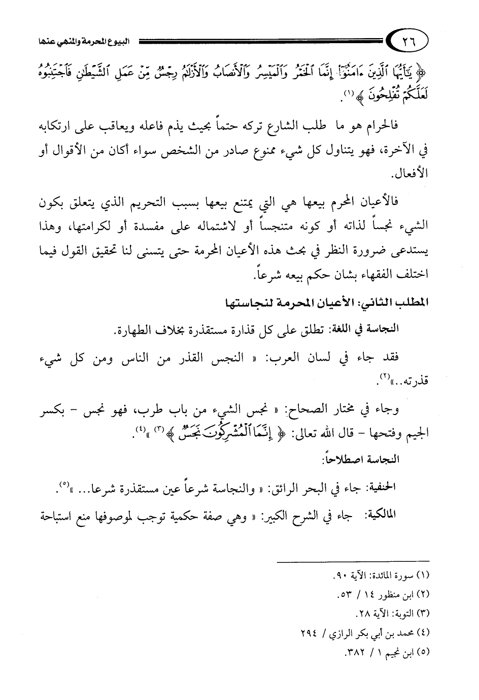 فالأعيان المحرم بيعها هي التي يمتنع بيعها بسبب التحريم الذي يتعلق بكون الشيء نجساً لذاته أو كونه متنجساً أو لاشتماله على مفسدة أو لكرامتها، وهذا يستدعى ضرورة النظر في بحث هذه الأعيان المحرمة حتى يتسنى لنا تحقيق القول فيما اختلف الفقهاء بشان حكم بيعه شرعاً.