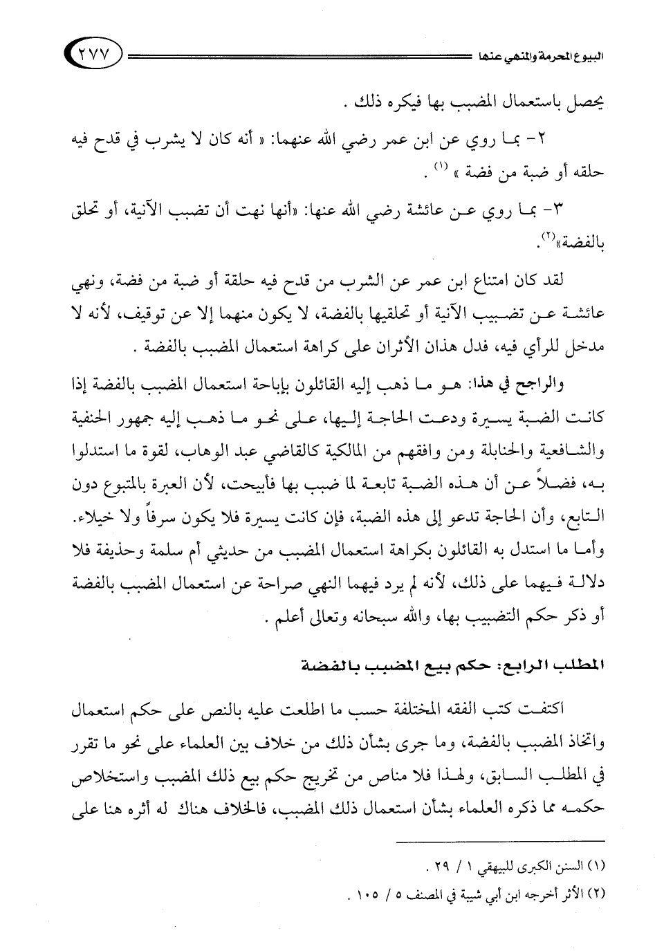2- بما روي عن ابن عمر رضي الله عنهما: "أنه كان لا يشرب في قدح فيه حلقه أو ضبة من فضة"1.