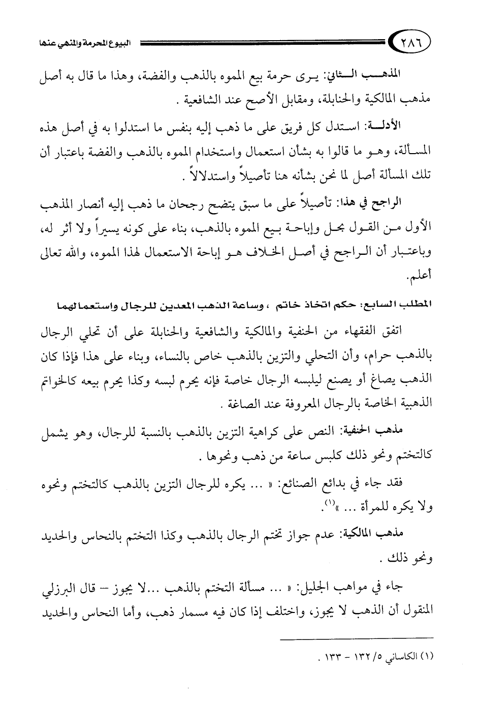 اتفق الفقهاء من الحنفية والمالكية والشافعية والحنابلة على أن تحلي الرجال بالذهب حرام، وأن التحلي والتزين بالذهب خاص بالنساء، وبناء على هذا فإذا كان الذهب يصاغ أو يصنع ليلبسه الرجال خاصة فإنه يحرم لبسه وكذا يحرم بيعه كالخواتم الذهبية الخاصة بالرجال المعروفة عند الصاغة.