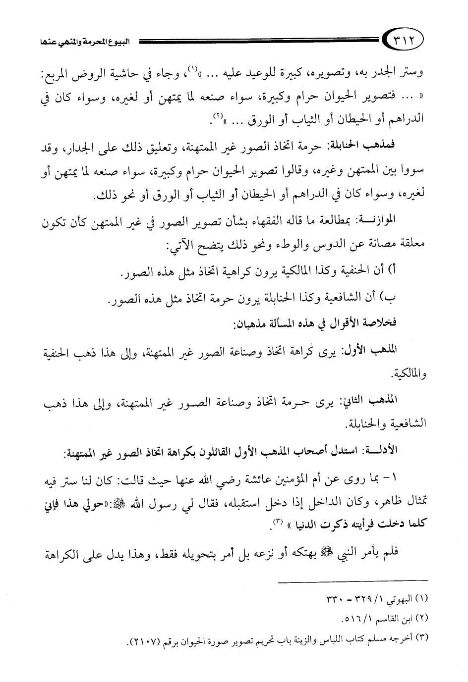 وجاء في حاشية الروض المربع: " ... فتصوير الحيوان حرام وكبيرة، سواء صنعه لما يمتهن أو لغيره، وسواء كان في الدراهم أو الحيطان أو الثياب أو الورق,.."2.