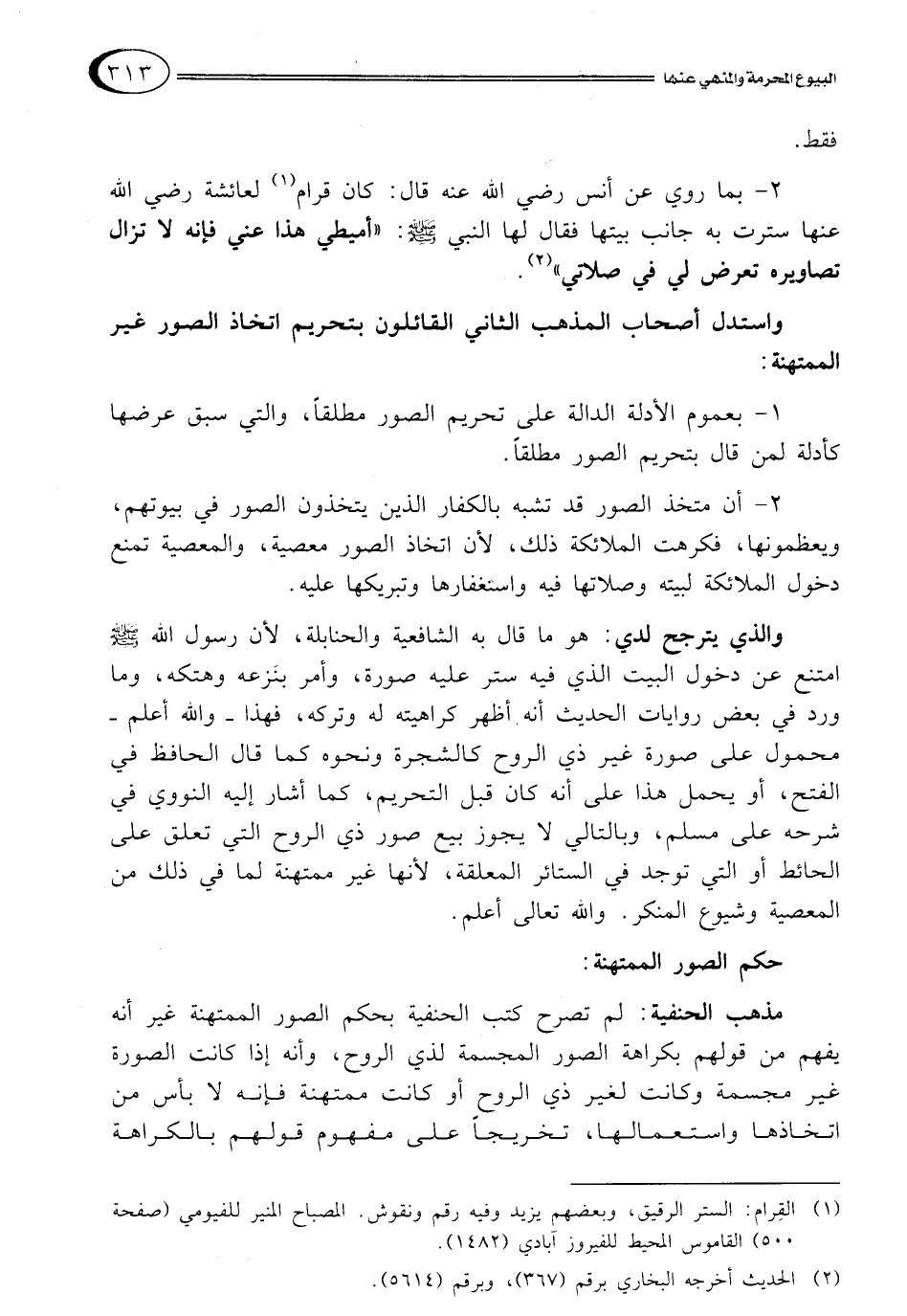2- بما روي عن أنس رضي الله عنه قال: كان قرام1 لعائشة رضي الله سترت به جانب بيتها فقال لها النبي صلى الله عليه وسلم: "أميطى هذا عني فإنه لا تزال تصاويره تعرض لي في صلاتي" 2.