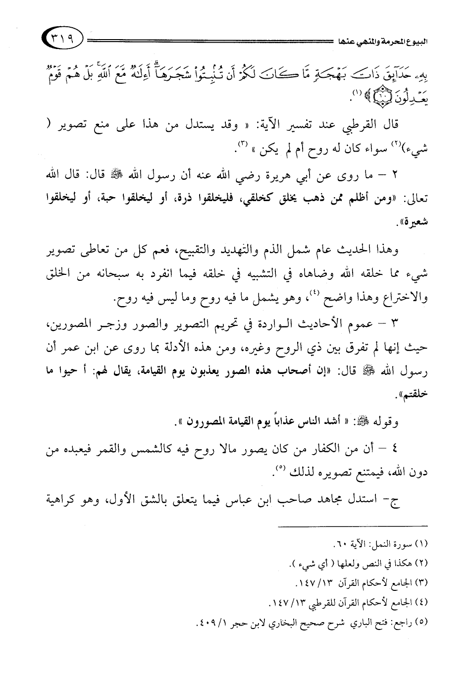 قال القرطبي عند تفسير الآية: "وقد يستدل من هذا على منع تصوير شيء 2 سواء كان له روح أم لم يكن"3.