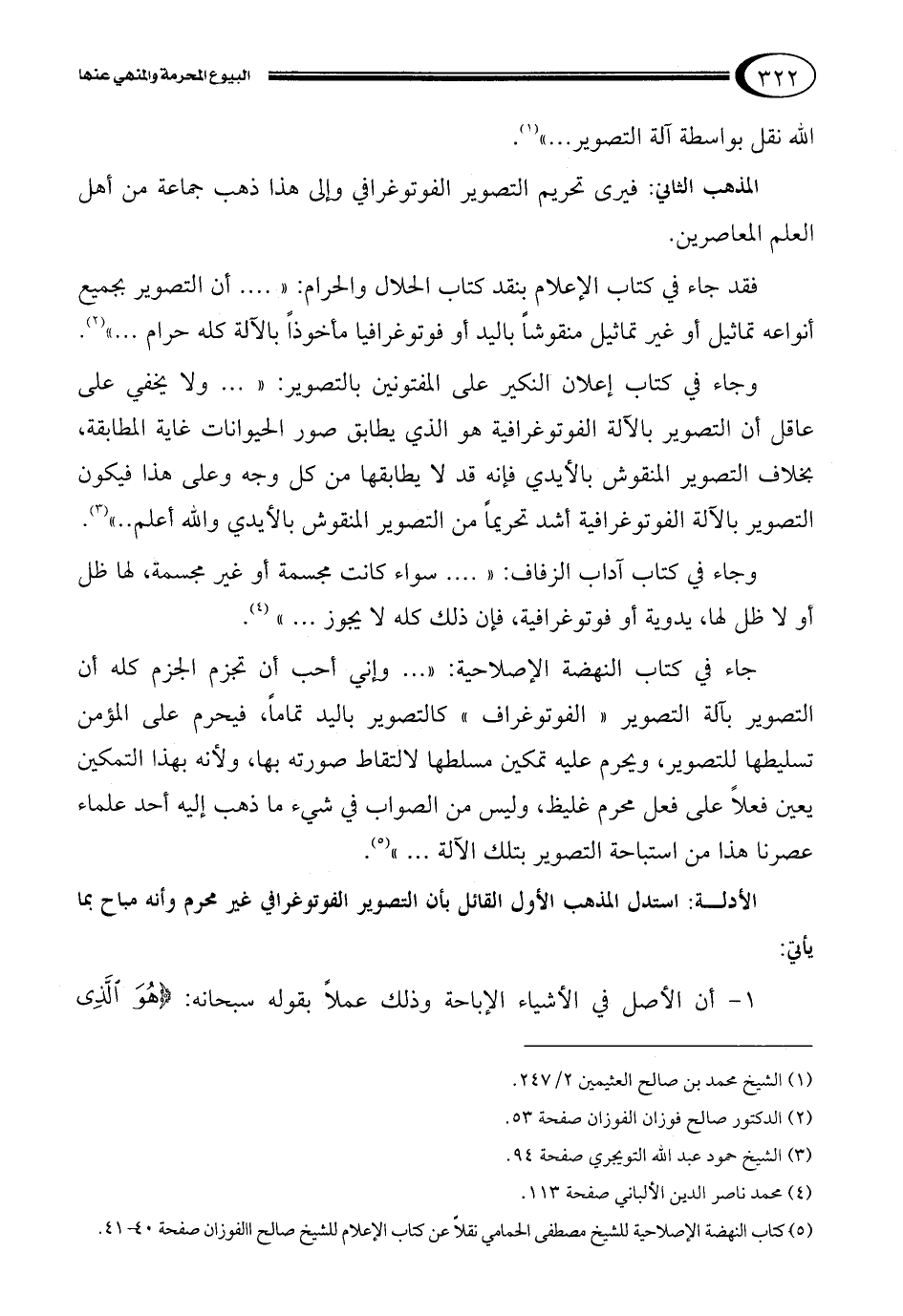 فقد جاء في كتاب الإعلام بنقد كتاب الحلال والحرام: ".... أن التصوير بجميع أنواعه تماثيل أو غير تماثيل منقوشاً باليد أو فوتوغرافيا مأخوذاً بالآلة كله حرام,.."2.