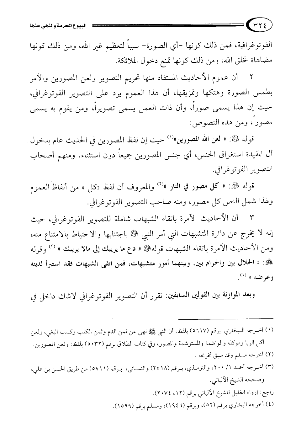 3 – أن الأحاديث الآمرة باتقاء الشبهات شاملة للتصوير الفوتوغرافي، حيث إنه لا يخرج عن دائرة المتشبهات التي أمر النبي صلى الله عليه وسلم باجتنابها والاحتياط بالامتناع منه، ومن الأحاديث الآمرة باتقاء الشبهات قولهصلى الله عليه وسلم "دع ما يريبك إلى مالا يريبك" 3 وقوله صلى الله عليه وسلم: "الحلال بين والحرام بين، وبينهما أمور متشبهات، فمن اتقى الشبهات فقد استبرأ لدينه وعرضه" 4.