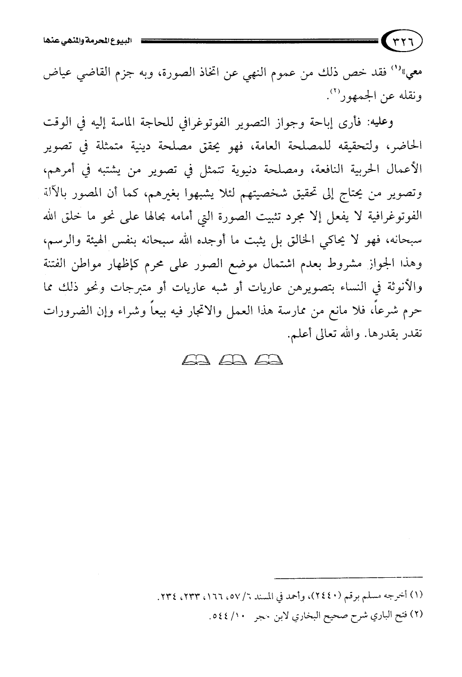 وعليه: فأرى إباحة وجواز التصوير الفوتوغرافي للحاجة الماسة إليه في الوقت الحاضر، ولتحقيقه للمصلحة العامة، فهو يحقق مصلحة دينية متمثلة في تصوير الأعمال الحربية النافعة، ومصلحة دنيوية تتمثل في تصوير من يشتبه في أمرهم، وتصوير من يحتاج إلى تحقيق شخصيتهم لئلا يشبهوا بغيرهم، كما أن المصور بالآلة الفوتوغرافية لا يفعل إلا مجرد تثبيت الصورة التي أمامه بحالها على نحو ما خلق الله سبحانه، فهو لا يحاكي الخالق بل يثبت ما أوجده الله سبحانه بنفس الهيئة والرسم، وهذا الجواز مشروط بعدم اشتمال موضع الصور على محرم كإظهار مواطن الفتنة والأنوثة في النساء بتصويرهن عاريات أو شبه عاريات أو متبرجات ونحو ذلك مما حرم شرعاً، فلا مانع من ممارسة هذا العمل والاتجار فيه بيعاً وشراء وإن الضرورات تقدر بقدرها. والله تعالى أعلم.