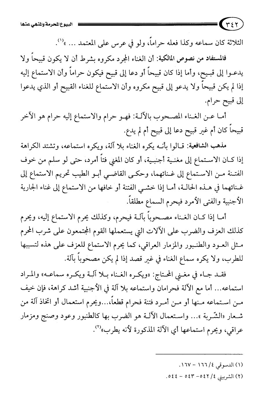 الثلاثة كان سماعه وكذا فعله حراماً، ولو في عرس على المعتمد ... "1.