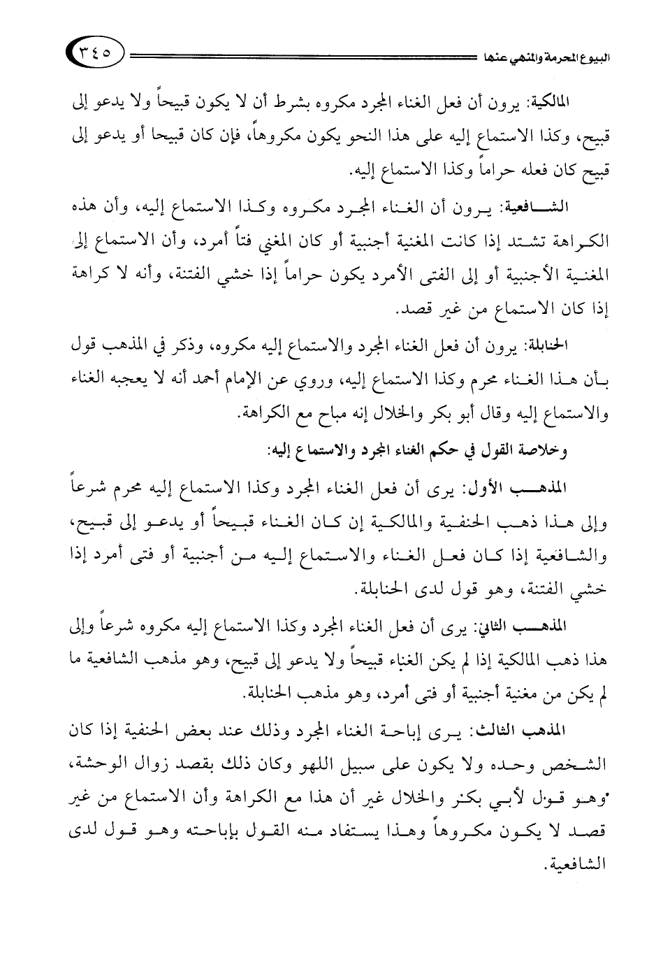 المذهب الأول: يرى أن فعل الغناء المجرد وكذا الاستماع إليه محرم شرعاً وإلى هذا ذهب الحنفية والمالكية إن كان الغناء قبيحاً أو يدعو إلى قبيح، والشافعية إذا كان فعل الغناء والاستماع إليه من أجنبية أو فتى أمرد إذا خشي الفتنة، وهو قول لدى الحنابلة.