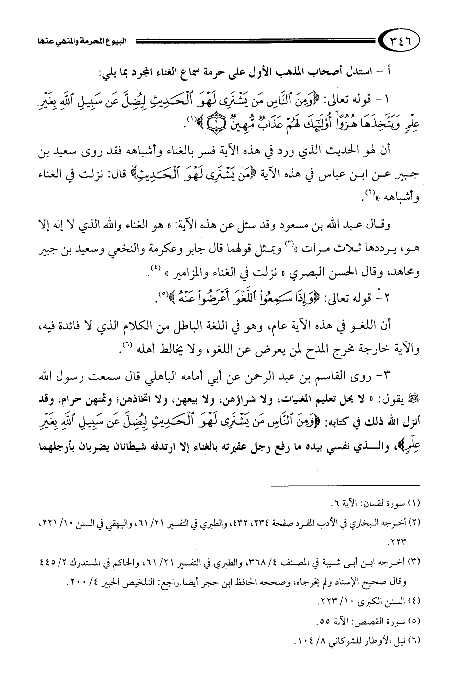 1- قوله تعالى: {وَمِنَ النَّاسِ مَنْ يَشْتَرِي لَهْوَ الْحَدِيثِ لِيُضِلَّ عَنْ سَبِيلِ اللَّهِ بِغَيْرِ عِلْمٍ وَيَتَّخِذَهَا هُزُواً أُولَئِكَ لَهُمْ عَذَابٌ مُهِينٌ} 1.