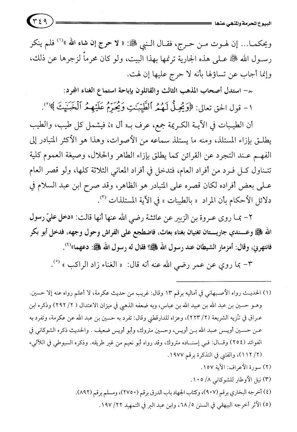 2- بما روى عروة بن الزبير عن عائشة رضي الله عنها أنها قالت: "دخل عليّ رسول الله صلى الله عليه وسلم وعندي جاريتان تغنيان بغناء بعاث، فاضطجع على الفراش وحول وجهه، فدخل أبو بكر فانتهرني، وقال: أمزمار الشيطان عند رسول الله صلى الله عليه وسلم؟ فقال له رسول الله صلى الله عليه وسلم: "دعهما" 4.