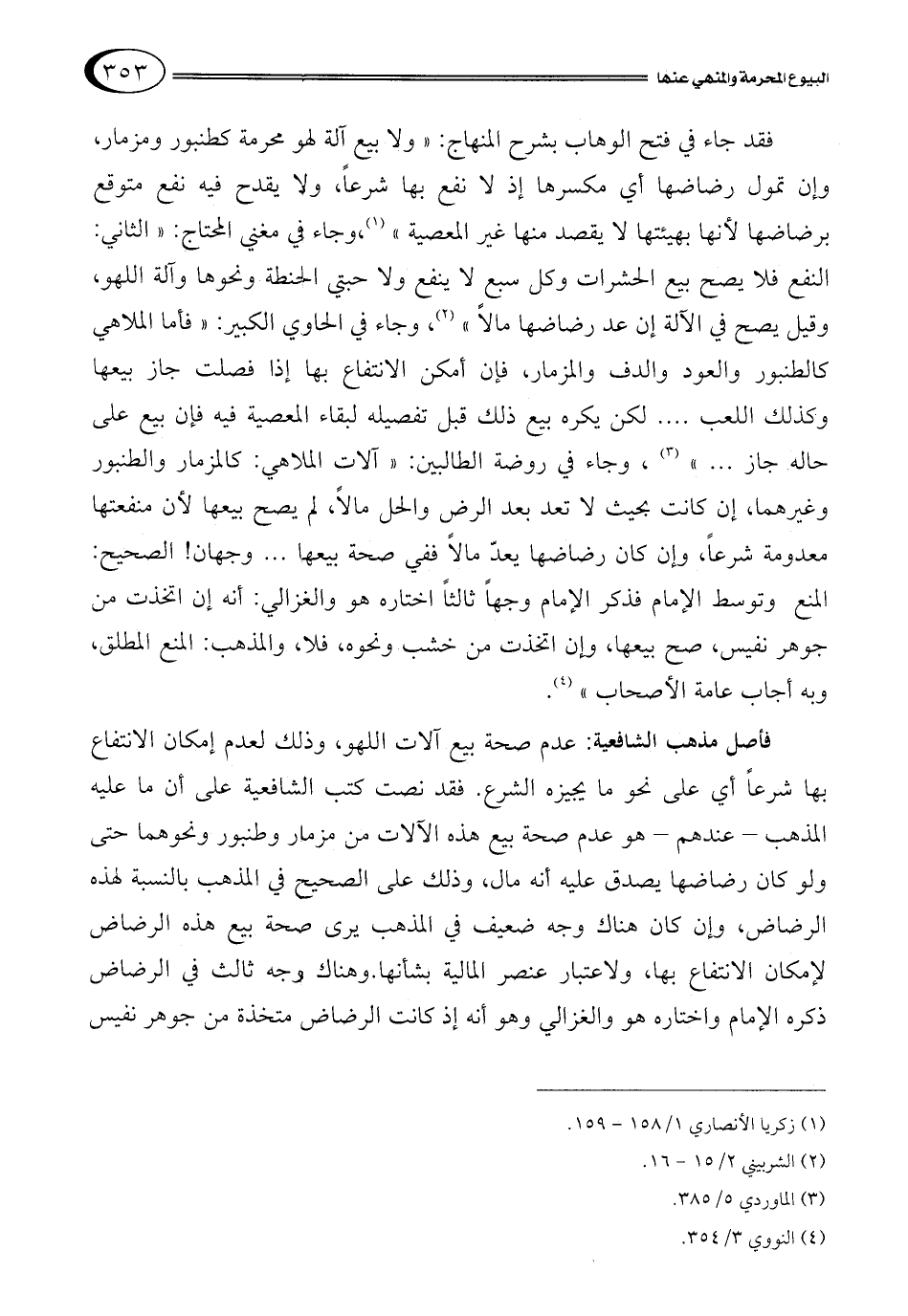 فقد جاء في فتح الوهاب بشرح المنهاج: "ولا بيع آلة لهو محرمة كطنبور ومزمار، وإن تمول رضاضها أي مكسرها إذ لا نفع بها شرعاً، ولا يقدح فيه نفع متوقع برضاضها لأنها بهيئتها لا يقصد منها غير المعصية"1. وجاء في مغني المحتاج: "الثاني: النفع فلا يصح بيع الحشرات وكل سبع لا ينفع ولا حبتي الحنطة ونحوها وآلة اللهو، وقيل يصح في الآلة إن عد رضاضها مالاً"2. وجاء في الحاوي الكبير: "فأما الملاهي كالطنبور والعود والدف والمزمار، فإن أمكن الانتفاع بها إذا فصلت جاز بيعها وكذلك اللعب.... لكن يكره بيع ذلك قبل تفصيله لبقاء المعصية فيه فإن بيع على حاله جاز ... "3 وجاء في روضة الطالبين: "آلات الملاهي: كالمزمار والطنبور وغيرهما، إن كانت بحيث لا تعد بعد الرض والحل مالاً، لم يصح بيعها لأن منفعتها معدومة شرعاً، وإن كان رضاضها يعدّ مالاً ففي صحة بيعها ... وجهان! الصحيح: المنع. وتوسط الإمام فذكر الإمام وجهاً ثالثاً اختاره هو والغزالي: أنه إن اتخذت من جوهر نفيس، صح بيعها، وإن اتخذت من خشب ونحوه، فلا، والمذهب: المنع المطلق، وبه أجاب عامة الأصحاب"4.
