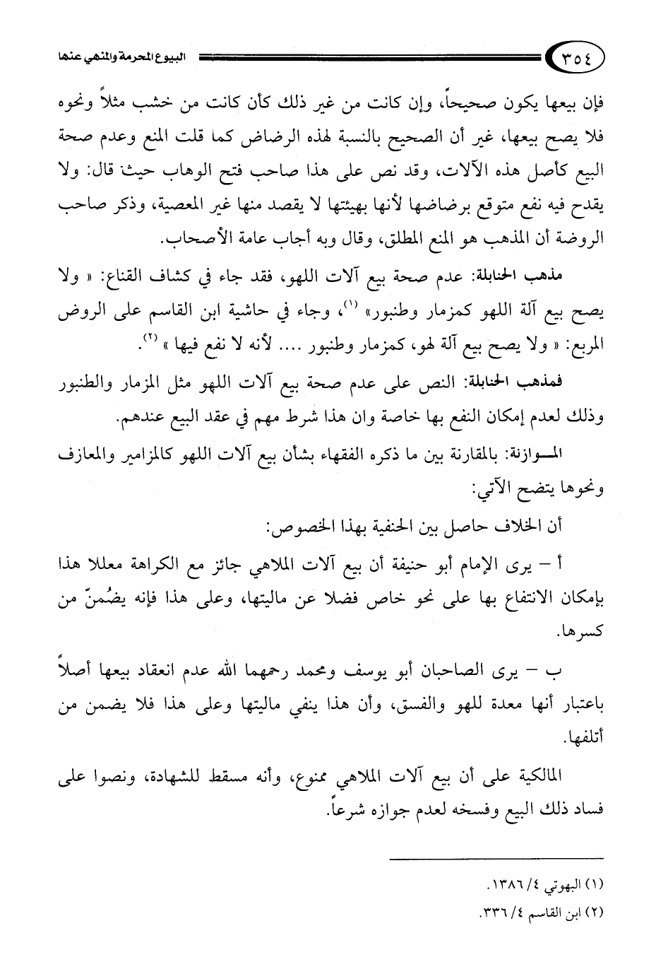 فإن بيعها يكون صحيحاً، وإن كانت من غير ذلك كأن كانت من خشب مثلاً ونحوه فلا يصح بيعها، غير أن الصحيح بالنسبة لهذه الرضاض كما قلت المنع وعدم صحة البيع كأصل هذه الآلات، وقد نص على هذا صاحب فتح الوهاب حيث قال: ولا يقدح فيه نفع متوقع برضاضها لأنها بهيئتها لا يقصد منها غير المعصية، وذكر صاحب الروضة أن المذهب هو المنع المطلق، وقال وبه أجاب عامة الأصحاب.