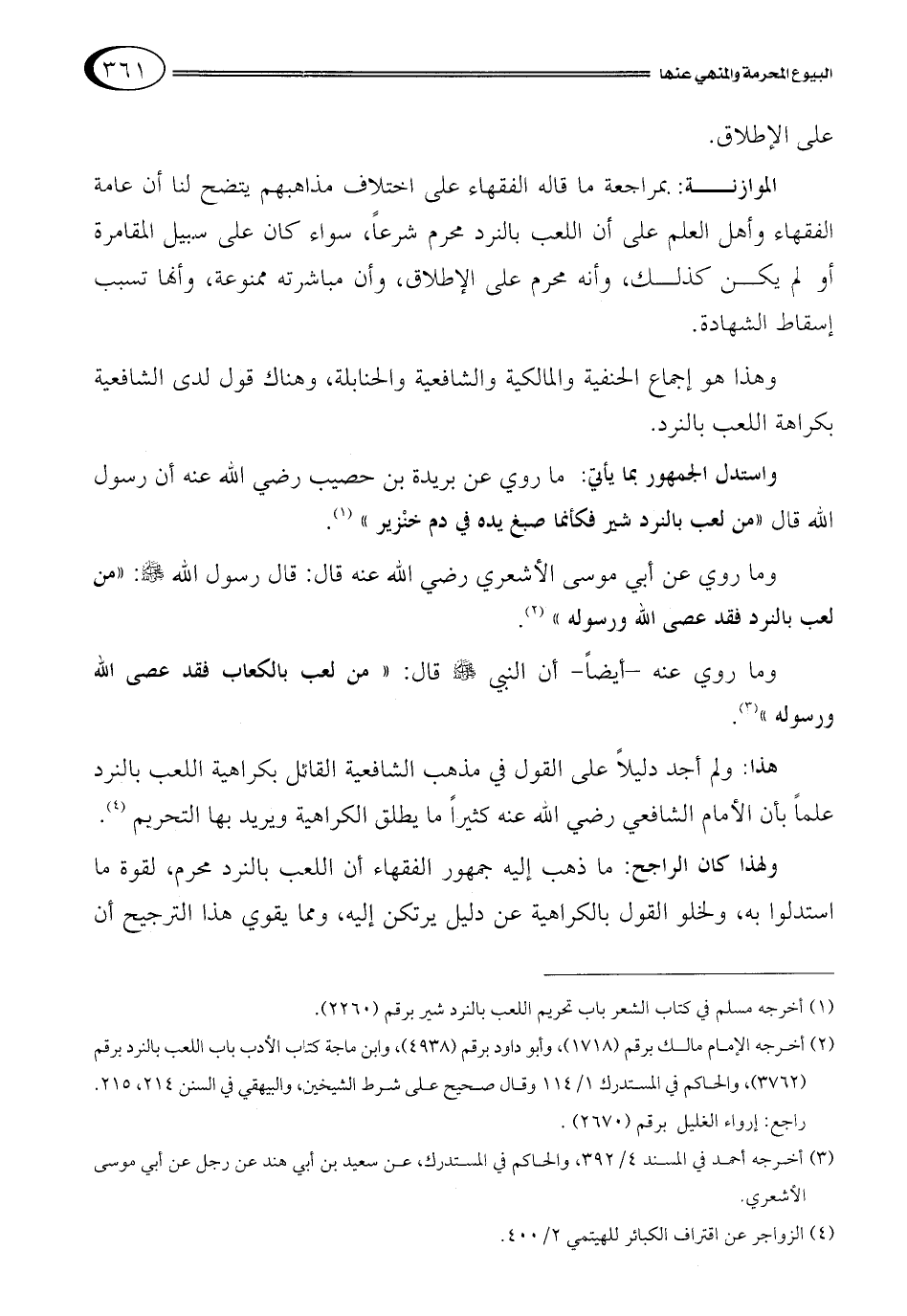 هذا: ولم أجد دليلاً على القول في مذهب الشافعية القائل بكراهية اللعب بالنرد علماً بأن الأمام الشافعي رضي الله عنه كثيراً ما يطلق الكراهية ويريد بها التحريم 4.