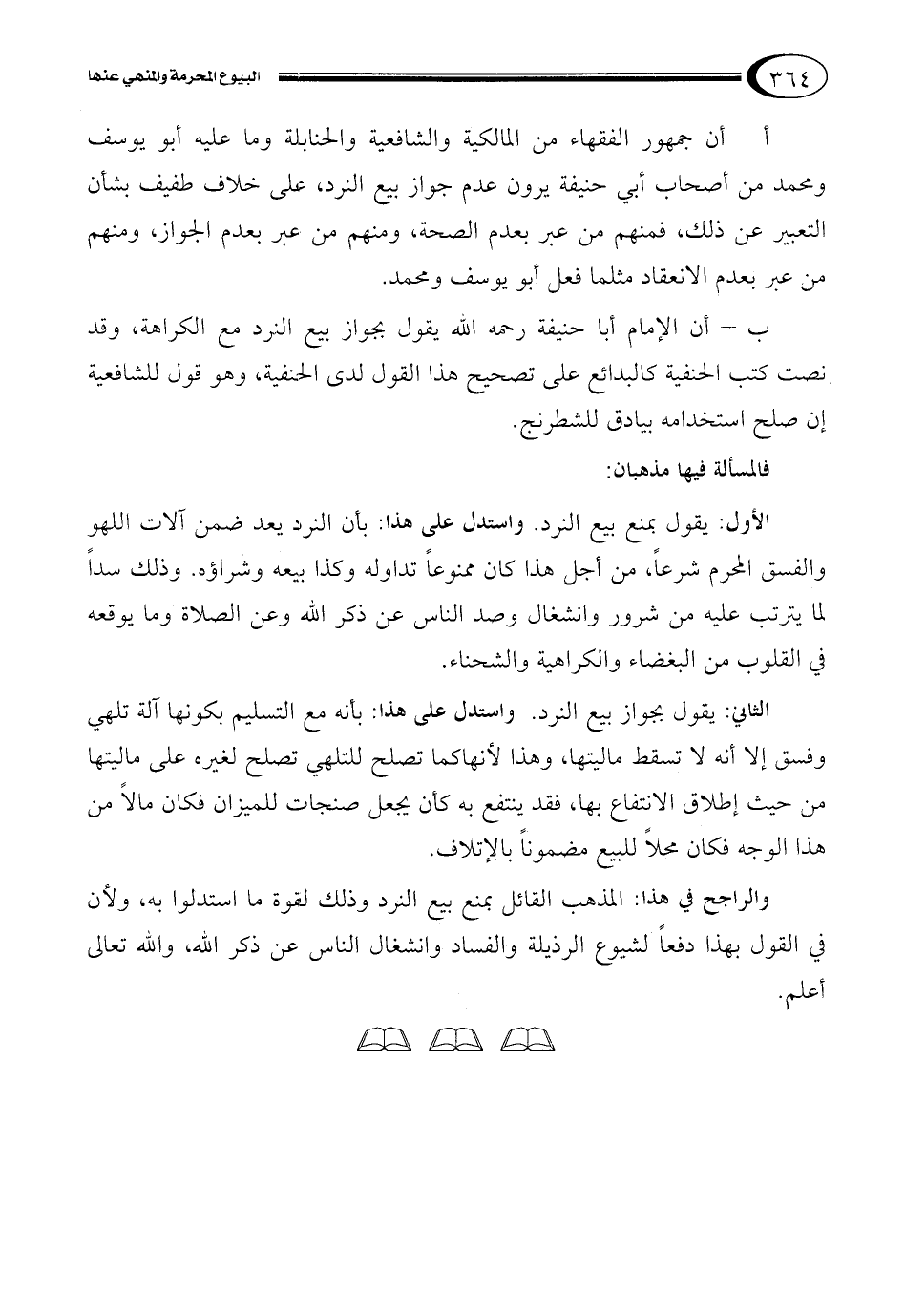 أ – أن جمهور الفقهاء من المالكية والشافعية والحنابلة وما عليه أبو يوسف ومحمد من أصحاب أبي حنيفة يرون عدم جواز بيع النرد، على خلاف طفيف بشأن التعبير عن ذلك، فمنهم من عبر بعدم الصحة، ومنهم من عبر بعدم الجواز، ومنهم من عبر بعدم الانعقاد مثلما فعل أبو يوسف ومحمد.
