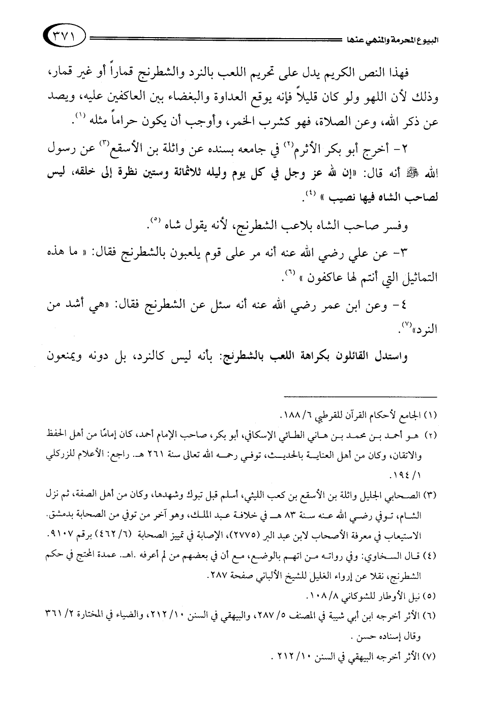 4- وعن ابن عمر رضي الله عنه أنه سئل عن الشطرنج فقال: "هي أشد من النرد"7.