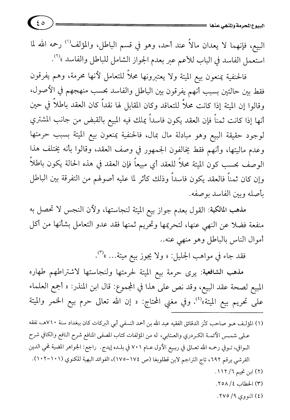 فقد جاء في مواهب الجليل: "ولا يجوز بيع ميتة ... "3.