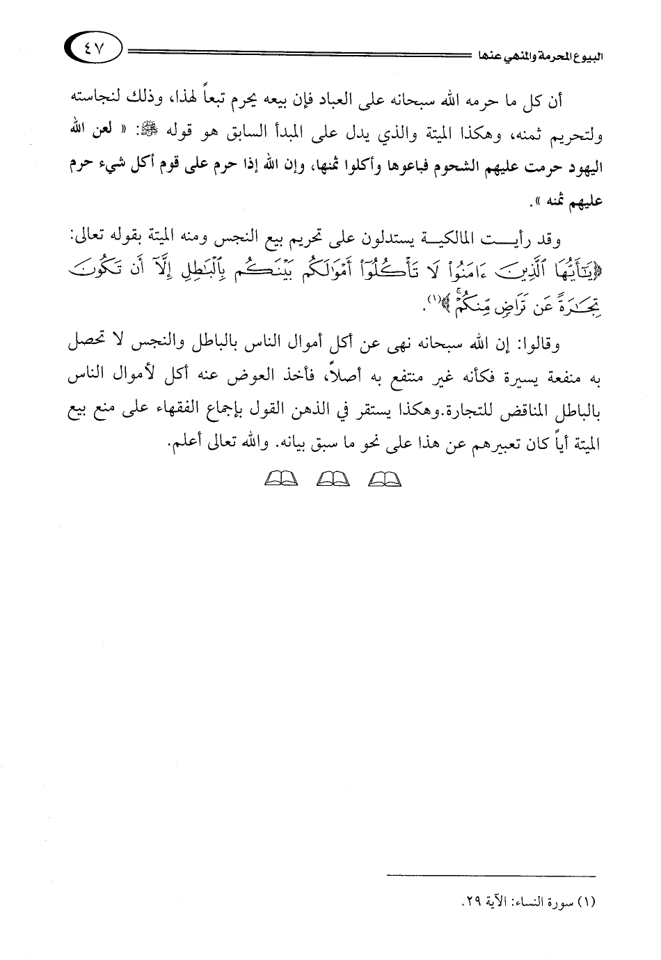 أن كل ما حرمه الله سبحانه على العباد فإن بيعه يحرم تبعاً لهذا، وذلك لنجاسته ولتحريم ثمنه، وهكذا الميتة والذي يدل على المبدأ السابق هو قوله صلى الله عليه وسلم: "لعن الله اليهود حرمت عليهم الشحوم فباعوها وأكلوا ثمنها، وإن الله إذا حرم على قوم أكل شيء حرم عليهم ثمنه".