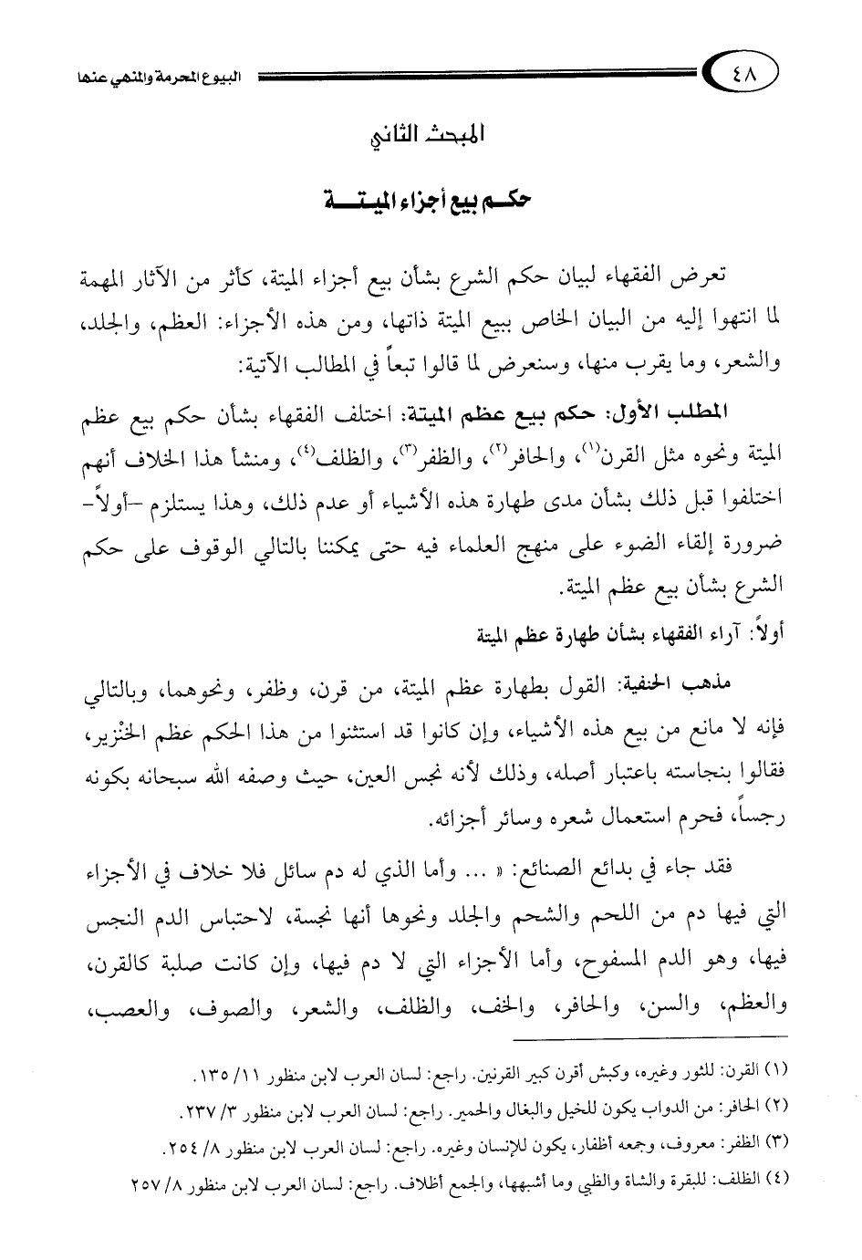 اختلف الفقهاء بشأن حكم بيع عظم الميتة ونحوه مثل القرن1، والحافر2، والظفر3، والظلف4، ومنشأ هذا الخلاف أنهم اختلفوا قبل ذلك بشأن مدى طهارة هذه الأشياء أو عدم ذلك، وهذا يستلزم -أولاً- ضرورة إلقاء الضوء على منهج العلماء فيه حتى يمكننا بالتالي الوقوف على حكم الشرع بشأن بيع عظم الميتة.