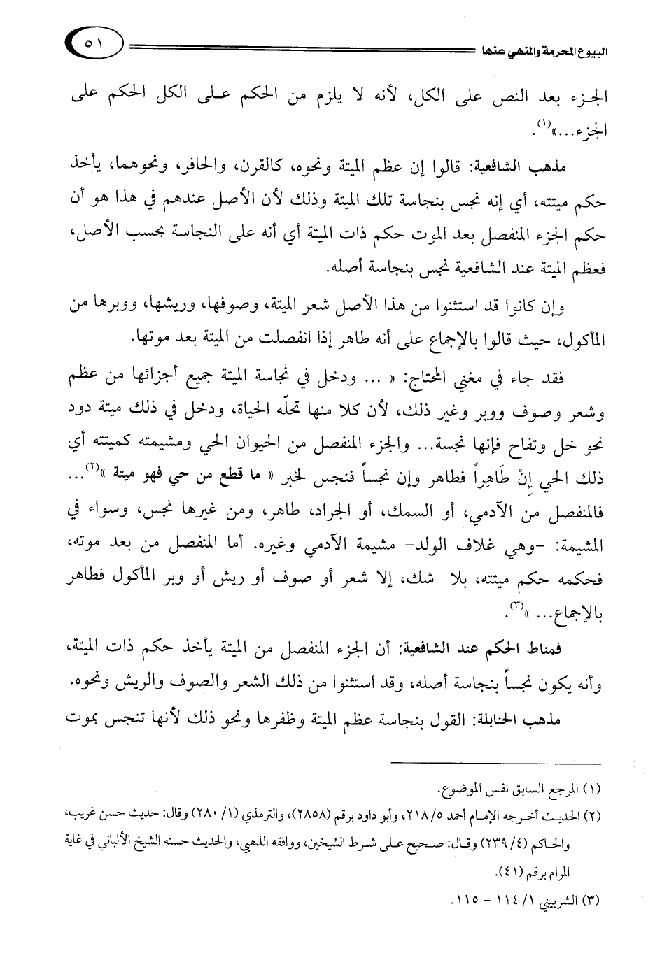 فقد جاء في مغني المحتاج: " ... ودخل في نجاسة الميتة جميع أجزائها من عظم وشعر وصوف ووبر وغير ذلك، لأن كلا منها تحلّه الحياة، ودخل في ذلك ميتة دود نحو خل وتفاح فإنها نجسة ... والجزء المنفصل من الحيوان الحي ومشيمته كميتته أي ذلك الحي إِنْ طَاهِراً فطاهر وإن نجساً فنجس لخبر "ما قطع من حي فهو ميتة" 2 ... فالمنفصل من الآدمي، أو السمك، أو الجراد، طاهر، ومن غيرها نجس، وسواء في المشيمة: -وهي غلاف الولد- مشيمة الآدمي وغيره. أما المنفصل من بعد موته، فحكمه حكم ميتته، بلا شك، إلا شعر أو صوف أو ريش أو وبر المأكول فطاهر بالإجماع ... "3.