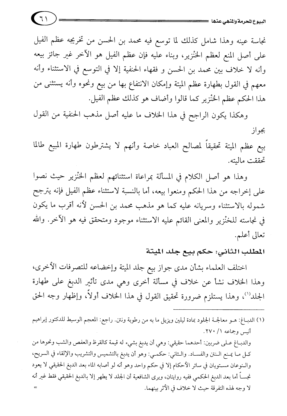 وهذا هو أصل الكلام في المسألة بمراعاة استثنائهم لعظم الخنْزير حيث نصوا على إخراجه من هذا الحكم ومنعوا بيعه، أما بالنسبة لاستثناء عظم الفيل فإنه يترجح شموله بالاستثناء وسريانه عليه كما هو مذهب محمد بن الحسن لأنه أقرب ما يكون في نجاسته للخنْزير والمعنى القائم عليه الاستثناء موجود ومتحقق فيه هو الآخر. والله تعالى أعلم.