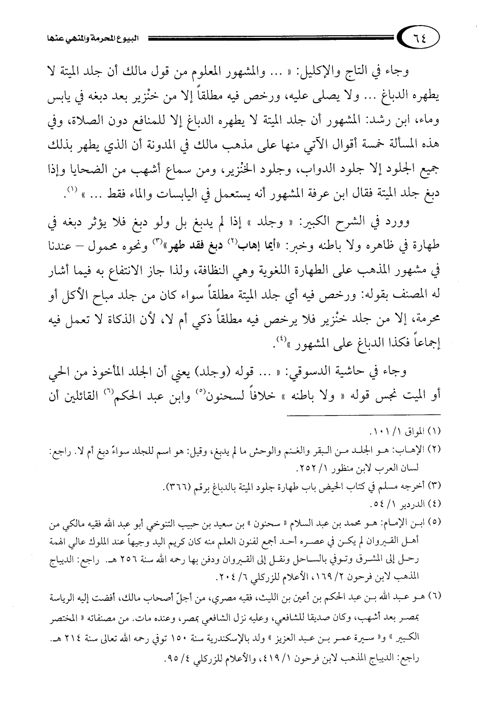 وجاء في حاشية الدسوقي: " ... قوله وجلد يعني أن الجلد المأخوذ من الحي أو الميت نجس قوله "ولا باطنه" خلافاً لسحنون5 وابن عبد الحكم6 القائلين أن