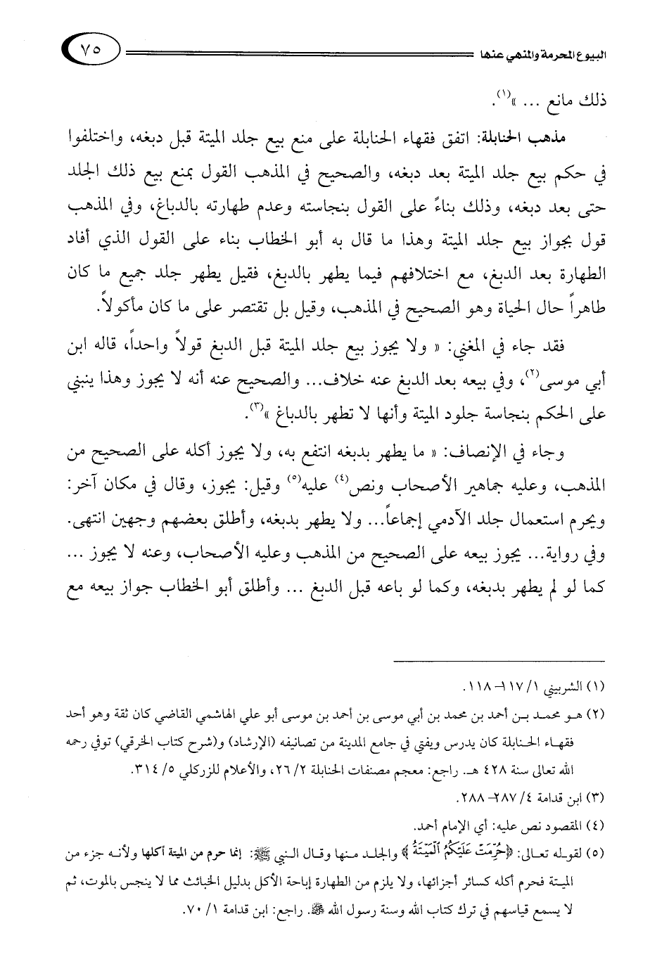 وجاء في الإنصاف: "ما يطهر بدبغه انتفع به، ولا يجوز أكله على الصحيح من المذهب، وعليه جماهير الأصحاب ونص4 عليه5 وقيل: يجوز، وقال في مكان آخر: ويحرم استعمال جلد الآدمي إجماعاً ... ولا يطهر بدبغه، وأطلق بعضهم وجهين انتهى. وفي رواية ... يجوز بيعه على الصحيح من المذهب وعليه الأصحاب، وعنه لا يجوز ... كما لو لم يطهر بدبغه، وكما لو باعه قبل الدبغ ... وأطلق أبو الخطاب جواز بيعه مع