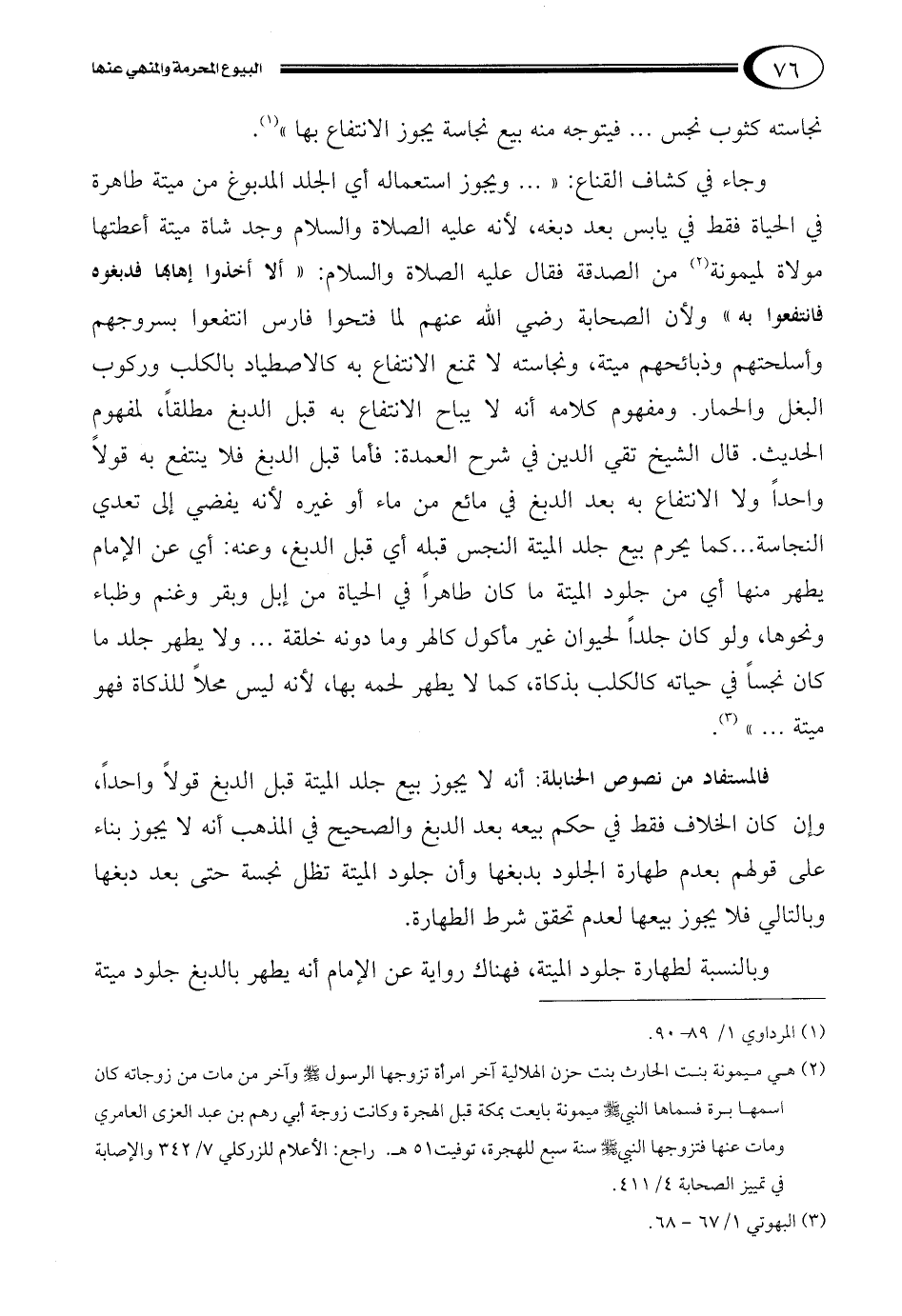 وجاء في كشاف القناع: " ... ويجوز استعماله أي الجلد المدبوغ من ميتة طاهرة في الحياة فقط في يابس بعد دبغه، لأنه عليه الصلاة والسلام وجد شاة ميتة أعطتها مولاة لميمونة2 من الصدقة فقال عليه الصلاة والسلام: "ألا أخذوا إهابها فدبغوه فانتفعوا به" ولأن الصحابة رضي الله عنهم لما فتحوا فارس انتفعوا بسروجهم وأسلحتهم وذبائحهم ميتة، ونجاسته لا تمنع الانتفاع به كالاصطياد بالكلب وركوب البغل والحمار. ومفهوم كلامه أنه لا يباح الانتفاع به قبل الدبغ مطلقاً، لمفهوم الحديث. قال الشيخ تقي الدين في شرح العمدة: فأما قبل الدبغ فلا ينتفع به قولاً واحداً ولا الانتفاع به بعد الدبغ في مائع من ماء أو غيره لأنه يفضي إلى تعدي النجاسة ... كما يحرم بيع جلد الميتة النجس قبله أي قبل الدبغ، وعنه: أي عن الإمام يطهر منها أي من جلود الميتة ما كان طاهراً في الحياة من إبل وبقر وغنم وظباء ونحوها، ولو كان جلداً لحيوان غير مأكول كالهر وما دونه خلقة ... ولا يطهر جلد ما كان نجساً في حياته كالكلب بذكاة، كما لا يطهر لحمه بها، لأنه ليس محلاً للذكاة فهو ميتة ... "3.