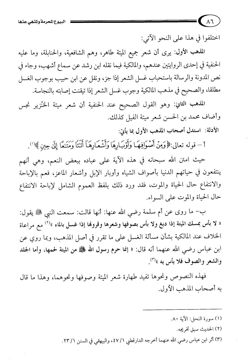 ب- ما روى عن أم سلمة رضي الله عنها: أنها قالت: سمعت النبي صلى الله عليه وسلم يقول: "لا بأس بمسك الميتة إذا دبغ ولا بأس بصوفها وشعرها وقرونها إذا غسل بالماء" 2 مع مراعاة الخلاف عند المالكية بشأن مسألة الغسل على ما تقرر في أصل المذهب، وبما روي عن ابن عباس رضي الله عنهما أنه قال: "إنما حرم رسول الله صلى الله عليه وسلم من الميتة لحمها، وأما الجلد والشعر والصوف فلا بأس به" 3.