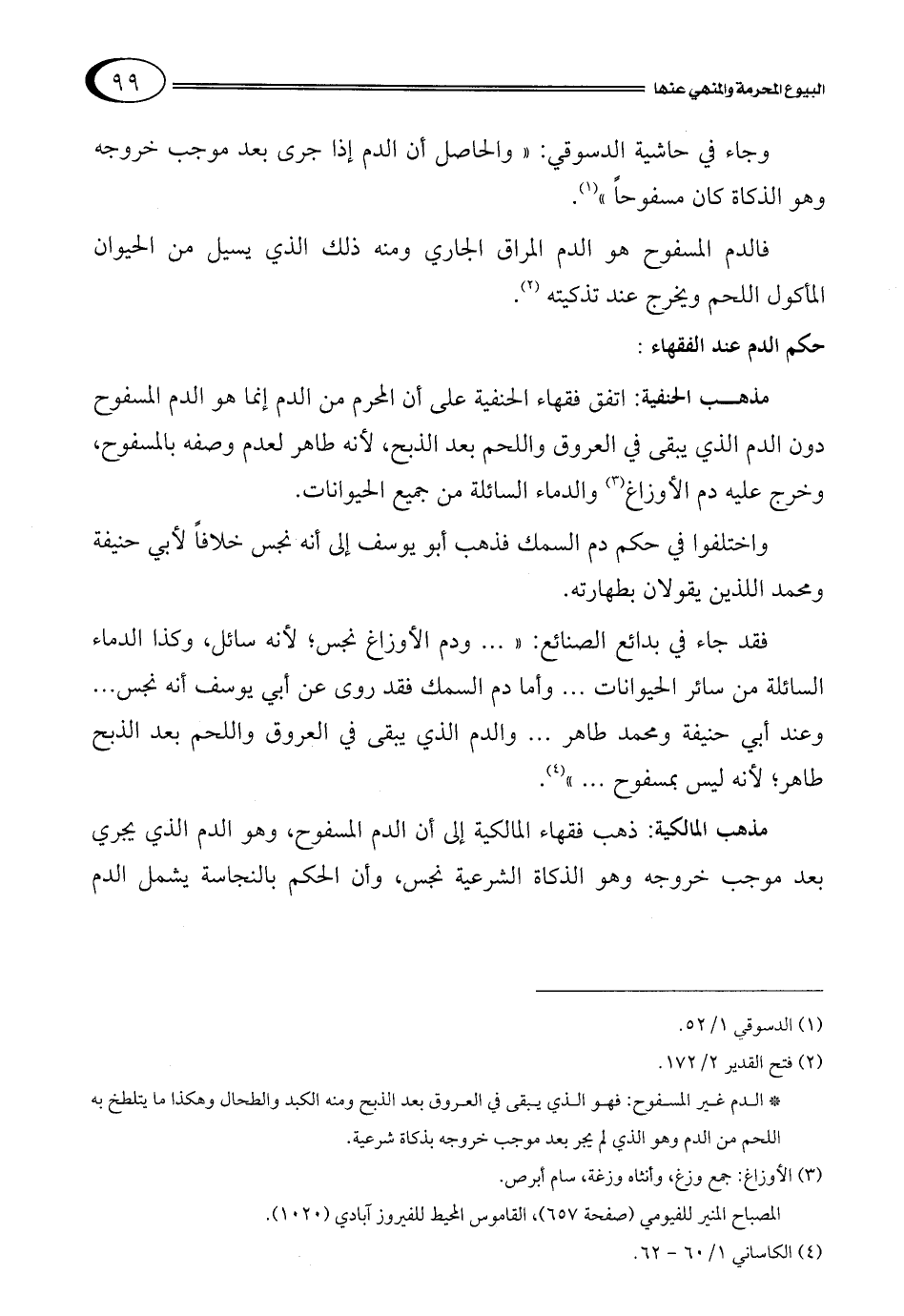 مذهب الحنفية: اتفق فقهاء الحنفية على أن المحرم من الدم إنما هو الدم المسفوح دون الدم الذي يبقى في العروق واللحم بعد الذبح، لأنه طاهر لعدم وصفه بالمسفوح، وخرج عليه دم الأوزاغ3 والدماء السائلة من جميع الحيوانات.
